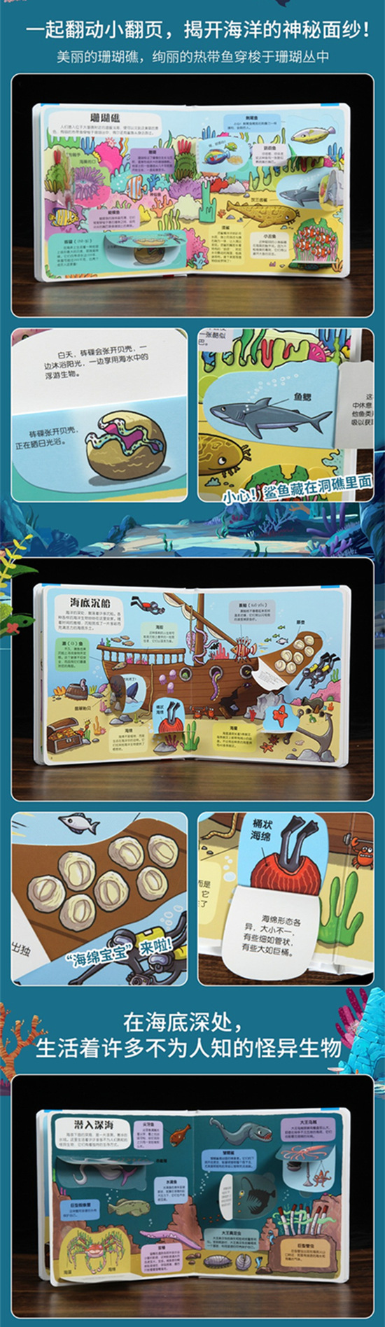 海洋里生活着哪些动物?珊瑚礁附近生活着哪些动物?海洋深处生活着哪些动物?……海洋里到处是一片生机盎然的样子,快来体验一下吧!活泼幽默的语言,可爱图画,让小读者在笑声中轻松学知识。有趣的翻翻页设计,增强互动,激发小读者的探索兴趣!
