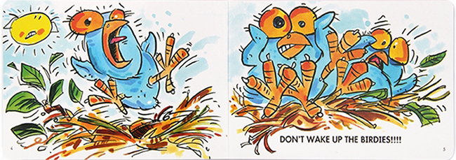 Birdies讲述了小鸟在休息的时候,被吵醒的故事。图上的小鸟被吵醒以后非常惊慌,可以看到天上的太阳也捂住了耳朵。小鸟被吵醒的时候可以问问孩子,如果是你,你会怎么做呢?培养孩子的同理心。