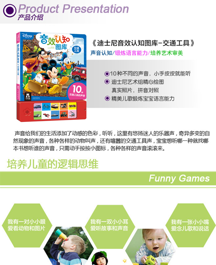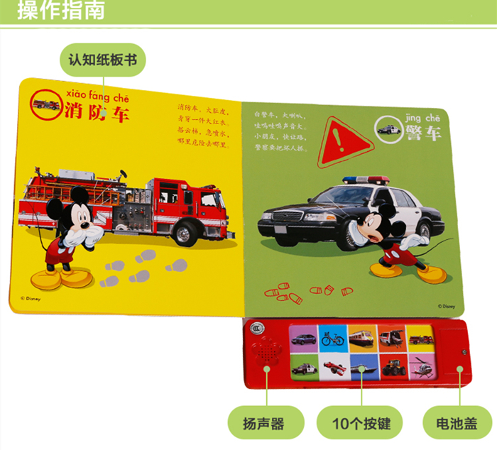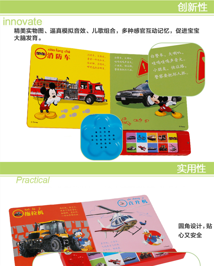 这一套由迪士尼明星带领宝宝认识身边事物的音效认识书。旨在给孩子一个更加新颖的学习方式,通过孩子常见的卡通人物引导,让孩子在玩乐的同时学习,通过声音和照片的双重刺激,培养孩子的注意力和集中能力,提高孩子的认知水平。。声音、照片、和儿歌的三位合一,能全方面的培养孩子的听觉、视觉和语言学习的能力,让每个宝宝都是一个全面发展的快乐儿童。