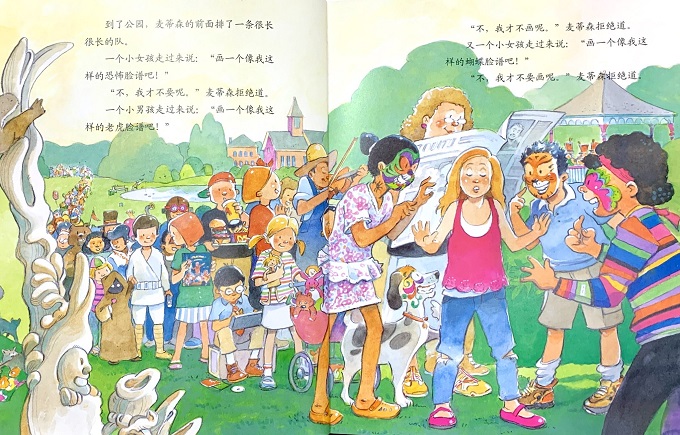 除了故事之外,插图也是蒙施图书的一大特色。蒙施图书中的插画有强烈的漫画感,看着书中的一幅幅漫画,就好象看到了动画片一个个静止的镜头。绘者迈克尔·马奇寇之所以选择这样的风格,都是为了配合蒙施笔下一个个诙谐风趣、现代感十足的新童话故事。画面中干净利落的线条,精致的细节刻画,也随处流露着幽默感、笑料不断,与文字配合相得益彰。封面、内文中有趣的细节伏笔,吸引孩子们的注意,仿佛寻宝一般,让孩子感受发现的乐趣。