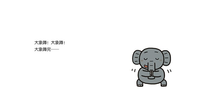 翻开*页,麦麦做了一个双手合十、双腿蹲的动作,家长们也可以请孩子们猜猜麦麦蹲完之后会怎样呢?当再翻到下一页大象的时候,就明朗啦!他会请谁来蹲呢?通过观察麦麦的变化和特征,相信小朋友们立刻就会联想到——接下来是大象蹲。用同样的方式,可以看看蹲完的小伙伴们都有哪些变化?通过这些变化,能猜得出下一个蹲的会是谁吗?