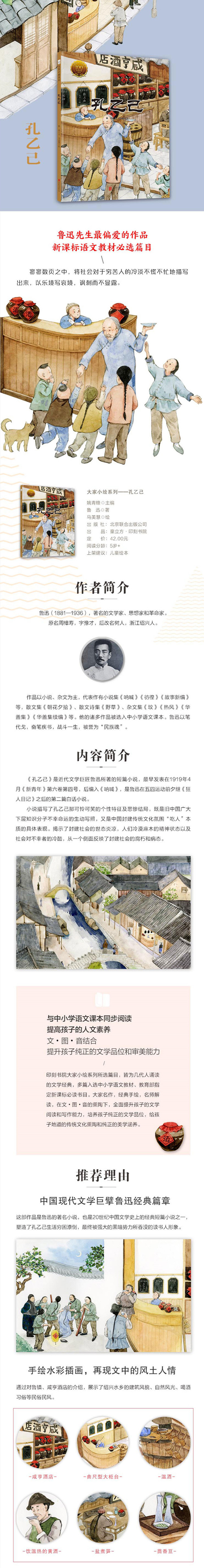 童立方·中国经典原创绘本大家小绘系列:孔乙己《孔乙己》是近代文学巨匠鲁迅所著的短篇小说,早发表在1919年4月《新青年》第六卷第四号,后编入《呐喊》,是鲁迅在“五四”运动前夕继《狂人日记》之后第二篇白话小说。小说描写了孔乙己那可怜而可笑的个性特征及悲惨结局,既是旧中国广大下层知识分子不幸命运的生动写照,又是中国封建传统文化氛围“吃人”本质的具体表现。揭示了封建社会的世态炎凉,人们冷漠麻木的精神状态以及社会对不幸者的冷酷,从一个侧面反映了封建社会的腐朽和病态。
