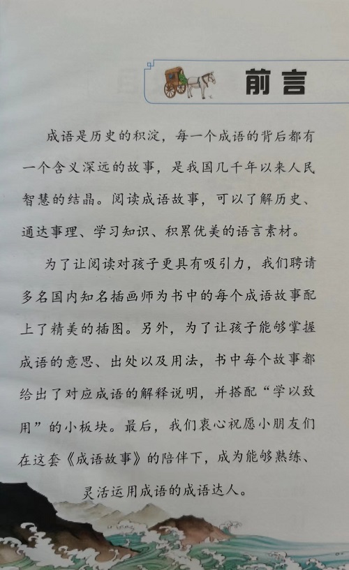 成语是历史的积淀,每一个成语的背后都有一个含义深远的故事,是我国几千年以来人民智慧的结晶。阅读成语故事,可以了解历史通达事理、学习知识、积累优美的语言素材 为了让阅读对孩子更具有吸引力,我们聘请多名国内知名插画师为书中的每个成语故事配上了精美的插图。另外,为了让孩子能够掌握成语的意思、出处以及用法,书中每个故事都给出了对应成语的解释说明,并搭配“学以致用”的小板块。最后,我们衷心祝愿小朋友们在这套《成语故事》的陪伴下,成为能够熟练、 灵活运用成语的成语达人。