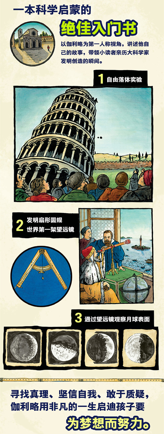 这是一本讲述伽利略的传记绘本,书中以伽利略为第一人称视角,从伽利略的角度描述他自己的故事。公元1564年,一个没有时钟、温度计与望远镜的世界,这一年,也是伽利略出生的那一年。透过观察、实验、计算以及许许多多精巧的装置,伽利略做出了众多惊人的科学新发现,他成为了使用望远镜观察星空的第一人,而他之后的科学家也受到他提出的太阳系理论的启发,最终证明了这一理论的正确性。伽利略的科学贡献如此之大,他被爱因斯坦称为“现代科学之父”。 ★第一人称视角,听伽利略讲故事。 ★入选2012年美国史密森尼学会《史密森尼杂志》最佳童书榜。 ★入选2013年美国科学教师协会(NSTA)与美国童书协会(CBC)评选的杰出科学童书榜。 ★全书大胆、浓密的黑色线条搭配鲜明、饱满的色彩,令人仿佛穿梭回到中世纪的欧洲,伽利略的世界被展现得栩栩如生。 ★一本科学启蒙的最佳入门书。以伽利略...