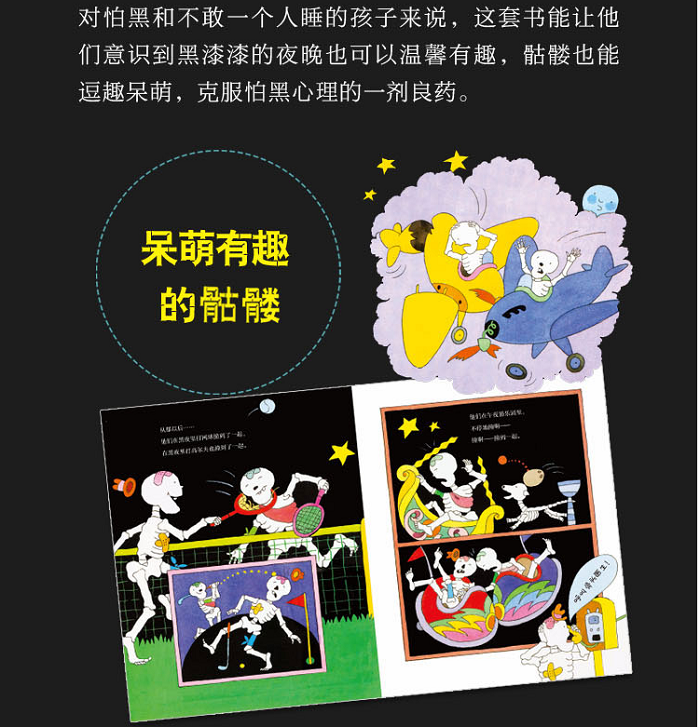 本系列图书讲的是一个大骷髅人和一个小骷髅人还有一只骷髅狗的趣味故事。故事文字简单,朗朗上口,便于孩子理解。图画干净利落,是骨骼启蒙书非常不错的选择。在大骷髅人、小骷髅人和骷髅狗的日常故事中展现情节与语言上的幽默性,有助于5-10岁的儿童学习基础词汇与句型,学会欣赏和使用韵律,学习拟声词及标点符号的使用。通过本书,可以让孩子初步了解骨骼,并绘制和标记人类/动物骨骼。图画方面,黑底与白色的大面积运用有助于形成对比,并引入黑夜与白天的话题讨论。同类图书有“骷髅狗”“飘着幽灵的小房子”“植物大战僵尸 科学漫画系列”等。