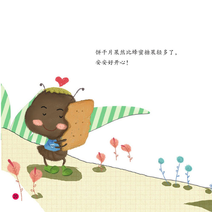 小蚂蚁安安发现了一块美味的牛奶饼干碎片,他想带回去和同伴分享。回家的路上,安安又发现了一颗香甜的蜂蜜糖果。安安想同时带回饼干和糖果,他一会儿搬饼干,一会儿搬糖果。渐渐地,天黑了,安安在树林里迷路了。请小朋友猜猜看,*后三心二意的安安能平安回家吗?