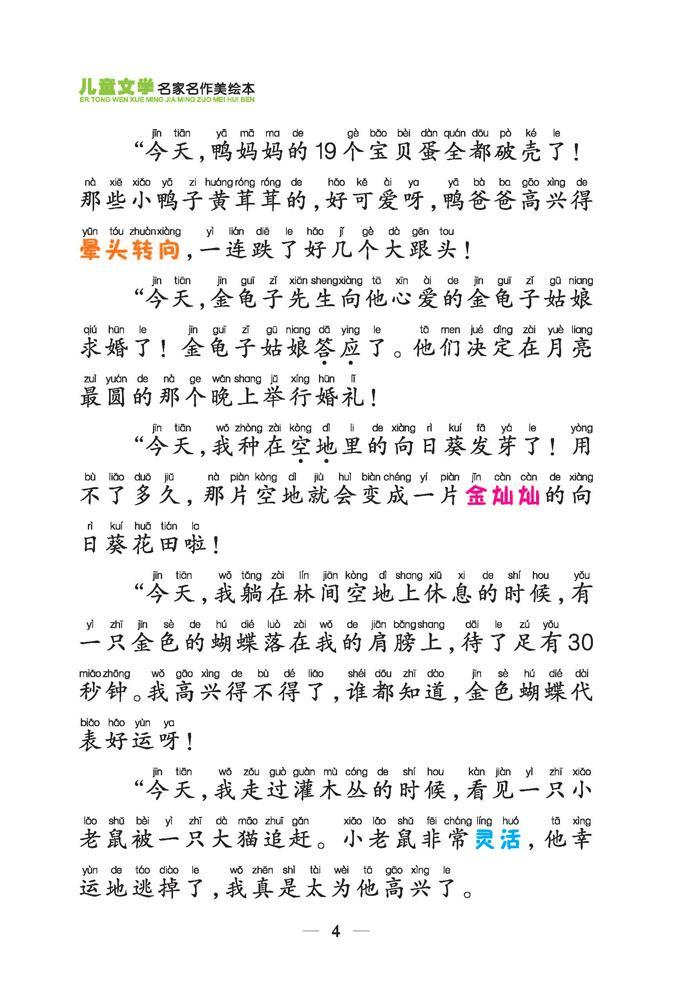 丛书选取了30位知名儿童文学作家原创的很好儿童文学作品 有长篇的 也有短篇的 以寓言、童话故事为主 每位作家一本书 共30本。故事内容符合儿童心理特点。文中好的词语都变了颜色加以突出 加深读者对一些精彩词语的记忆 对于经常出现的多音字或变声字加点 巩固读者对拼音的掌握 并且随文附加一些引人思考的小问题 有利于启迪儿童智慧 培养儿童积极健康的思想品质。很好的儿童故事配上精美的彩色插图 文图相映成趣 为孩子们以后的文学素养进行了一个良好的启蒙。