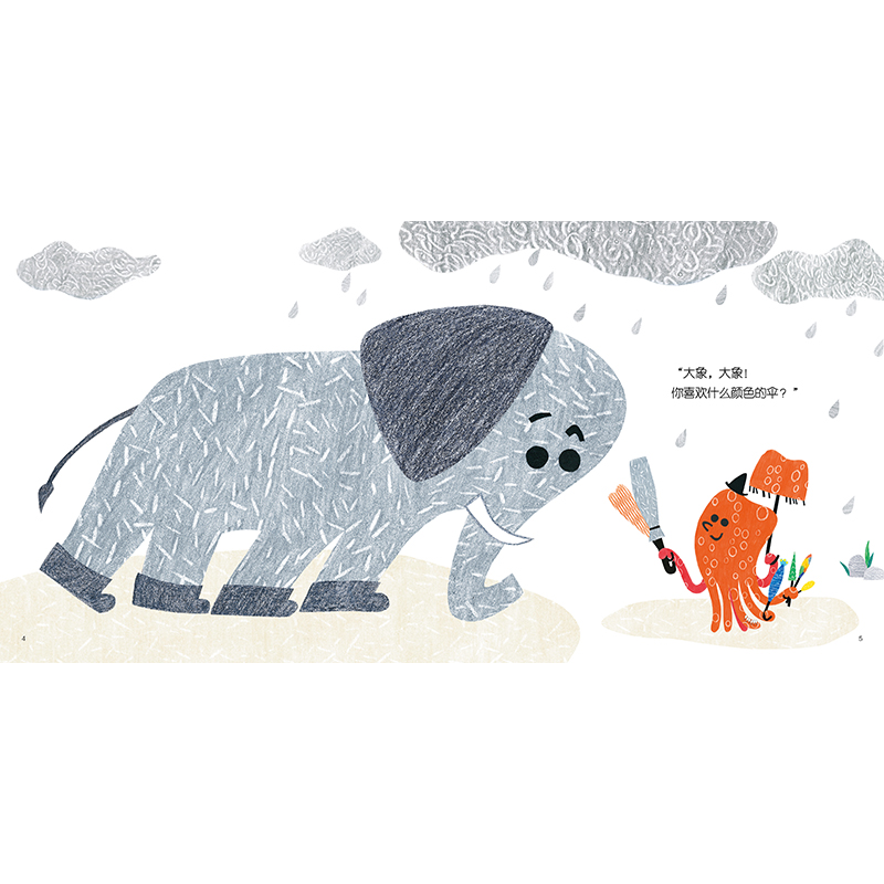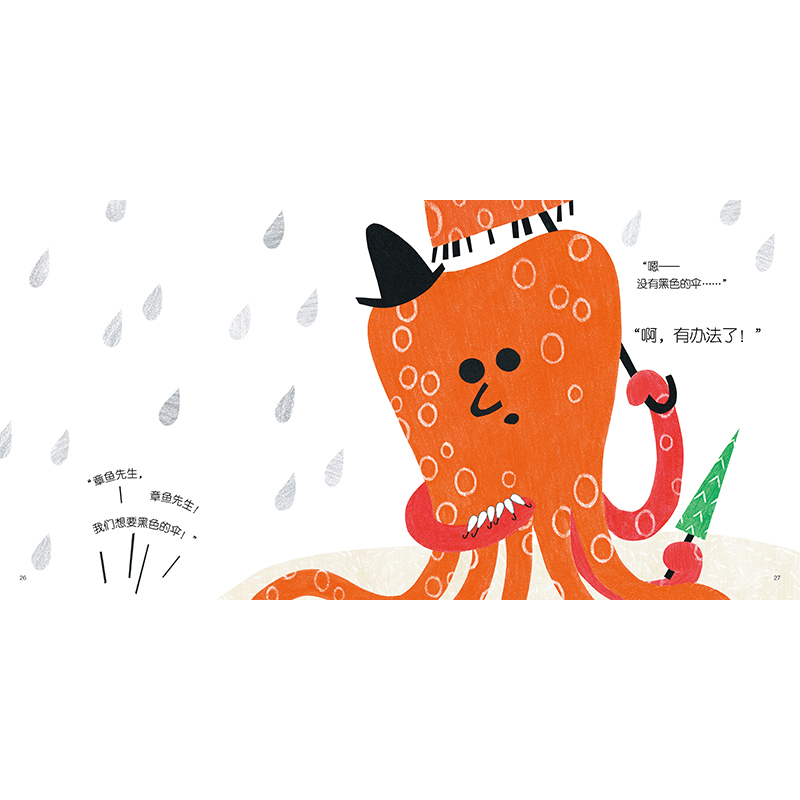 《章鱼先生卖雨伞》是一本献给0-3岁宝宝的动物认知和色彩启蒙图画书。下雨了!章鱼先生开始卖雨伞啦!大象、狮子、孔雀……它们想要的雨伞都不一样。会变色的动物、“看不见”的动物……它们的要求都有点儿怪。章鱼先生的雨伞,能让大家都满意吗?一起跟着韩煦来玩色彩游戏吧,让孩子跟着可爱的动物和 奇妙的情节一起体验色彩的魅力。