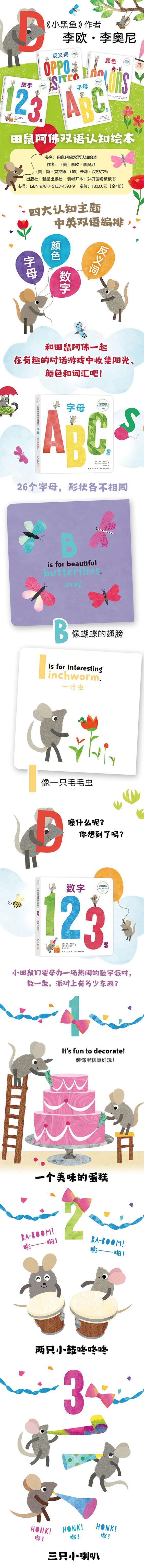 小黑鱼作者李欧·李奥尼双语纸板书来啦!数字派对、字母乐园、色彩王国、反义词大赛,和田鼠阿佛一起在有趣的对话游戏中收集阳光、颜色和词汇吧!简单而富有节奏的英文短句,色彩明快的拼贴画,带孩子感受语言的乐趣