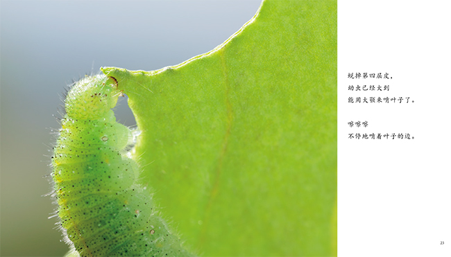 这是一套来自日本的著名生物摄影专家献给孩子们的昆虫摄影绘本集,摄影师们经过长期的实地跟踪拍摄,用分镜头写真大画面的形式淋漓尽致的展示了可爱的昆虫们产卵——孵化——小生命诞生——生长成熟的整个生长过程。那些栩栩如生的大画面写真图片生动而细致到令人感动。摄影师们或微观近拍、或宏观远景,用独特的视角收藏了小昆虫们生长的每一个精彩的瞬间,生生不息的大自然中生命独特而非凡的闪光点被一一收录。在每一册中,作者都会用忍不住怜爱的语气写道:“长啊长啊,长啊长啊,快快长大吧!”可以说,《生命的故事》揭示了生命之初的惊喜和其动人的生长过程,震撼的写真的图片,简洁而诗意的语言,将艺术欣赏与学习认知的功能融为一体。