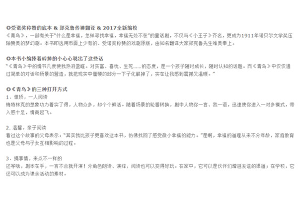 《青鸟》写了一对兄妹蒂蒂尔和米蒂尔去寻找一只青鸟,明白了幸福的真正含义的故事。圣诞节前夜,穷樵夫的一对儿女蒂蒂尔和米蒂尔睡着后,梦见仙女请他们为她病重的女儿寻找象征幸福的青鸟。于是,蒂蒂尔和米蒂尔在光、水、面包、火、糖、奶、猫和狗的陪伴下,开始了梦幻之旅……整个故事歌颂同情与友爱,探索人类幸福的真谛,是一部熔神奇、梦幻、象征于一炉的杰作。
