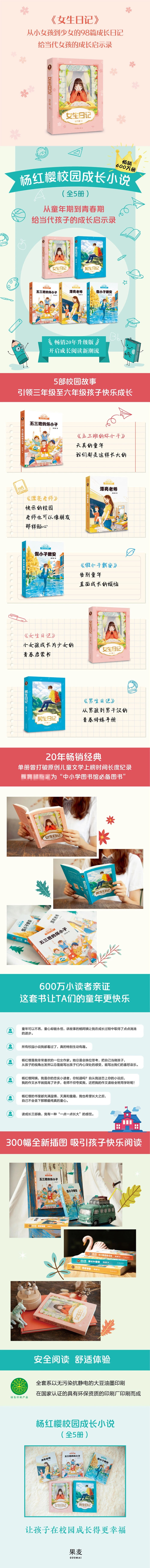 《女生日记》是一本杨红樱日记体校园成长小说。讲述了六年级女生冉冬阳从小女孩成长为少女的过程,及其生理、心理的微妙变化。六年级的生活,有压力有烦恼,冉冬阳一直努力对待学业,同时善良地帮助同学,她敏感地感受到自己生理和心理的变化,并在家人的帮助下,接受这些“成长的烦恼”,从一个小女孩成长成为了美丽的少女。《女生日记》自出版以来,便被称为“中国女孩的成长启示录”,作者用细腻的笔触, 刻画了女生在面临成长时复杂的矛盾心理,并鼓励女孩子认同、赞赏自己的性别身份,珍惜自己的成长经验。这本书已成为老师和家长与青春期女生沟通的重要桥梁。