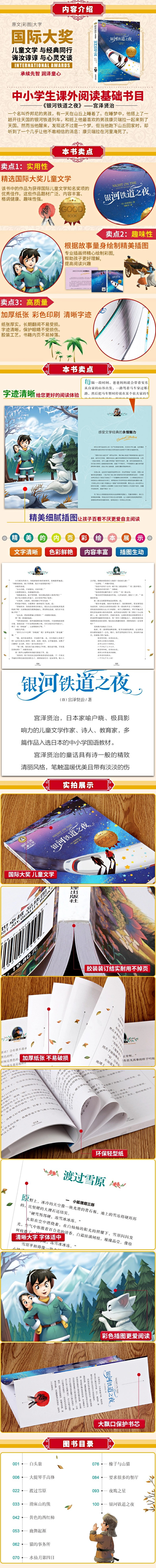 《银河铁道之夜》中收录了十篇宫泽贤治的经典童话作品。那些发生在铁道、星空、雪地、森林的一则则小故事,飘扬着丰富的想象力,飞舞着温馨童真的气息。其中《银河铁道之夜》一篇是代表宫泽贤治文学成就的经典之作,也是作者一生的,他八年四易其稿,直至生命终结前仍在加工润色,被称为“永远没有完结的童话故事”,壮丽银河之上的凄美感伤故事,饱含温暖的生命哲思。《银河铁道之夜》在日本被孩子们广泛阅读,它已经影响了几代人。它被喜爱的程度从《文艺春秋》杂志在1 989年所作的调查“20世纪你最喜欢的十本日本著作和十本海外著作”中就可以看得出来:《银河铁道之夜》与夏目漱石、森鸥外的作品同居第十位,远远领先于川端康成、太宰治、谷崎润一郎、三岛由纪夫等文学家的作品。