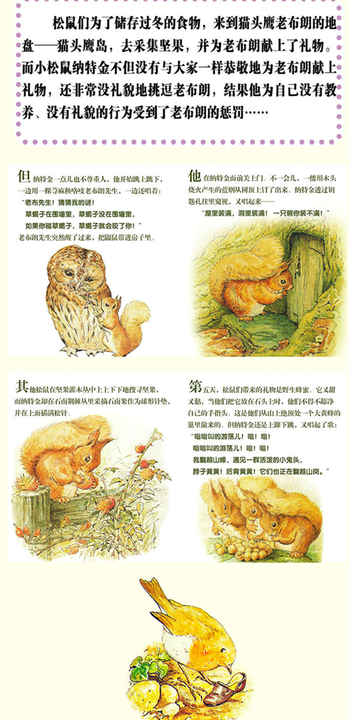 松鼠们为了储存过冬的食物,来到猫头鹰老布朗的地盘——猫头鹰岛,去采集坚果,并为老布朗献上了礼物。而小松鼠纳特金不但没有恭敬的和大家为老布朗送上礼物,还非常无礼地挑逗老布朗,结果他为自己没有教养,没有礼貌的行为受到了老布朗的惩罚……