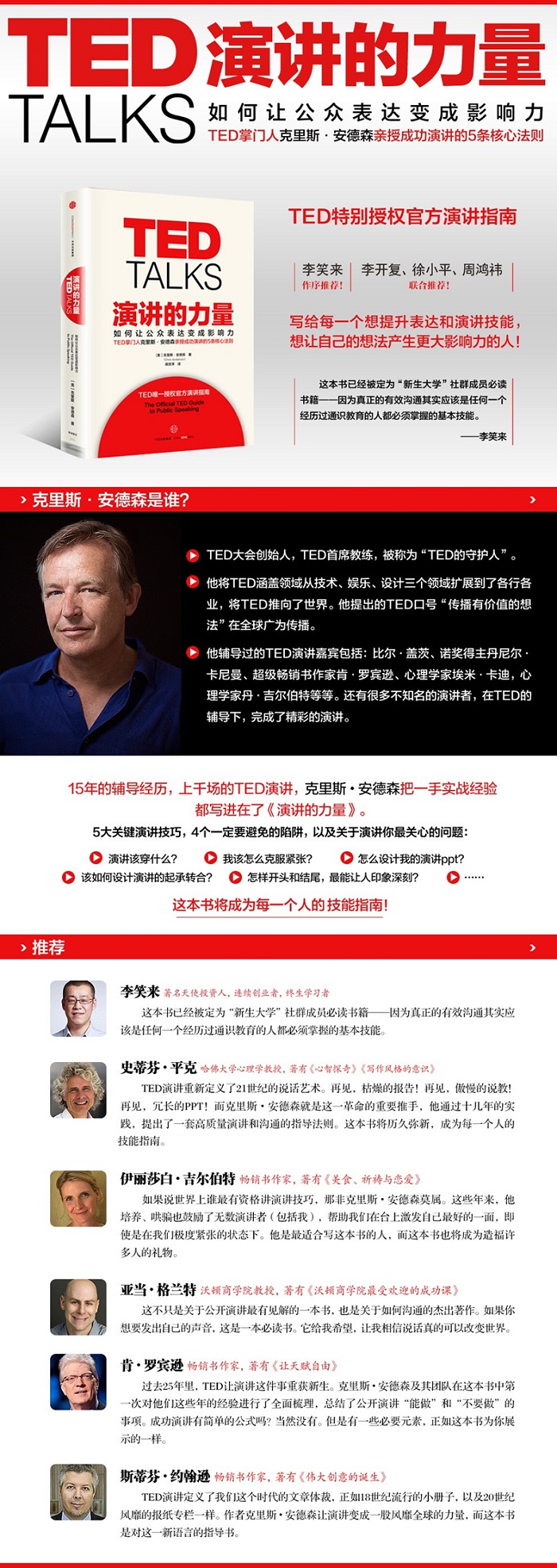 克里斯·安德森,TED的掌门人和演讲教练,15年来他参与并指导了上千场TED演讲,与比尔·盖茨、诺奖得主丹尼尔·卡尼曼、超级畅销作家肯·罗宾逊等无数优秀演讲者深入合作,总结了公开演讲实战经验。他把自己与TED团队的公开演讲经验,都写进在了这本书——《演讲的力量》。