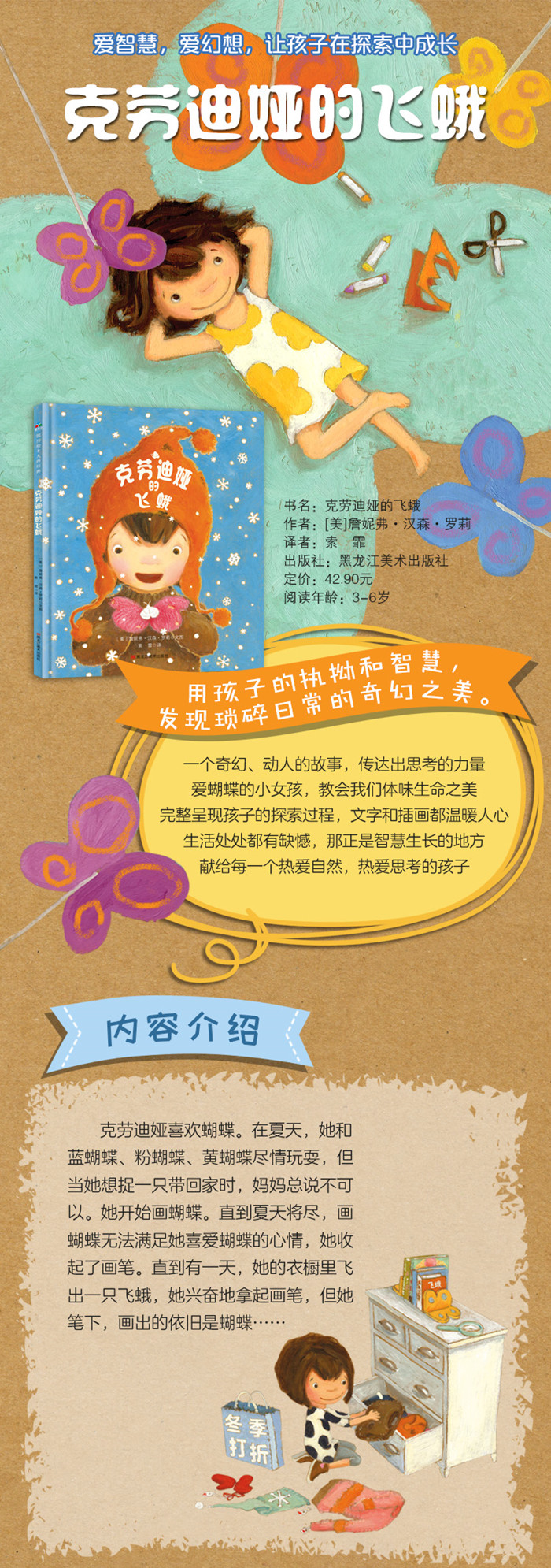 随着季节的变冷,热爱大自然的小女孩克劳迪娅对绘画产生了新的热情。她喜欢各种各样的蝴蝶:蓝色的、黄色的、紫色圆点的……既然不能带它们回家,她就用各种美丽的颜色来画它们。但冬天还是来了,再也没有蝴蝶画了……直到一只小飞蛾出现,她又看到一个全新的冬天。 .
