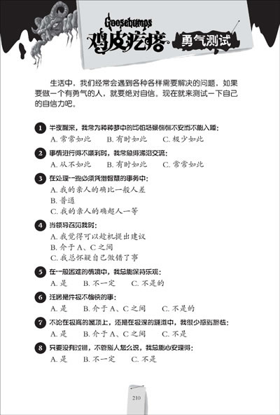 “勇气进化版鸡皮疙瘩”系列是全球级悬念大师R.L.斯坦代表作“鸡皮疙瘩系列丛书”全新版本,首批推出的10部作品选取“鸡皮疙瘩经典系列”中最受读者追捧的20个故事,并以法力无边的“银魔杖”标识统领。书中将传统幻想和惊险手法与当代科幻相结合,创造出一个个挑战想象力极限的情境和经历,使阅读宛如乘坐一列纸上“过山车”,惊险丛生,快乐无限。书后附加小百科、勇气测试、智力大挑战、开心驿站等精彩内容。它像一所勇敢者的训练营,提升读者的胆识勇气,拓展读者的想象空间,砥砺读者的健康心智,从而更积极、更乐观地面对生活和未来。