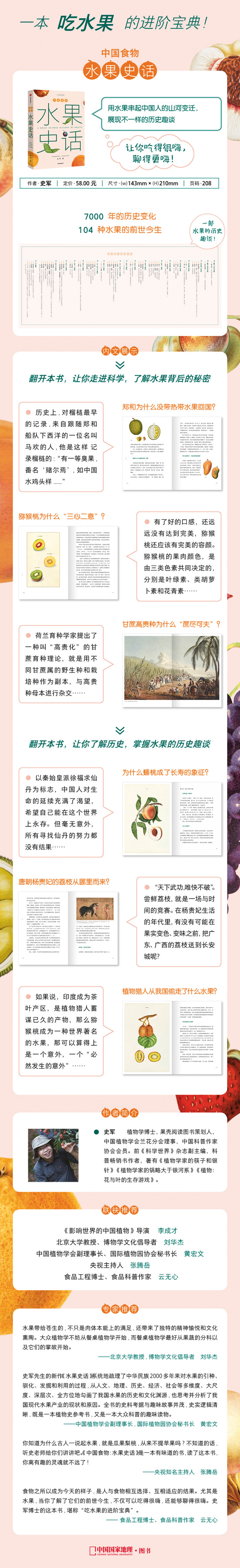 这是一本以中国水果为主题的轻阅读科普书,讲述了梨、桃、荔枝、柑橘等中国本土水果如何在广阔的华夏大地上生根发芽,葡萄、石榴、苹果等外来水果如何进入中国的一系列故事,让我们可以跨越时空去了解、熟悉不为人知的水果文化历史。 想了解“植物猎人如何窃取了我国的猕猴桃”“郑和下西洋为何不带回榴梿”“杨贵妃的荔枝从何而来”吗?一起来看看这本书吧!