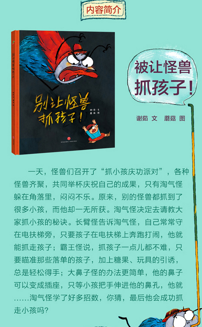 一天,怪兽们召开了“抓小孩庆功派对”,各种怪兽齐聚,共同举杯庆祝自己的成果,只有淘气怪躲在角落里,闷闷不乐。原来,别的怪兽都抓到了很多小孩,而他却一无所获。淘气怪决定去请教大家抓小孩的秘诀。长臂怪告诉淘气怪,自己常常守在电扶梯旁,只要孩子在电扶梯上奔跑打闹,他就能抓走孩子;霸王怪说,抓孩子一点儿都不难,只要瞄准那些落单的孩子,加上糖果、玩具的引诱,总是轻松得手;大鼻子怪的办法更简单,他的鼻子可以变成插座,只等小孩把手伸进他的鼻孔,他就......淘气怪学了好多招数,你猜,*后他会成功抓走小孩吗?