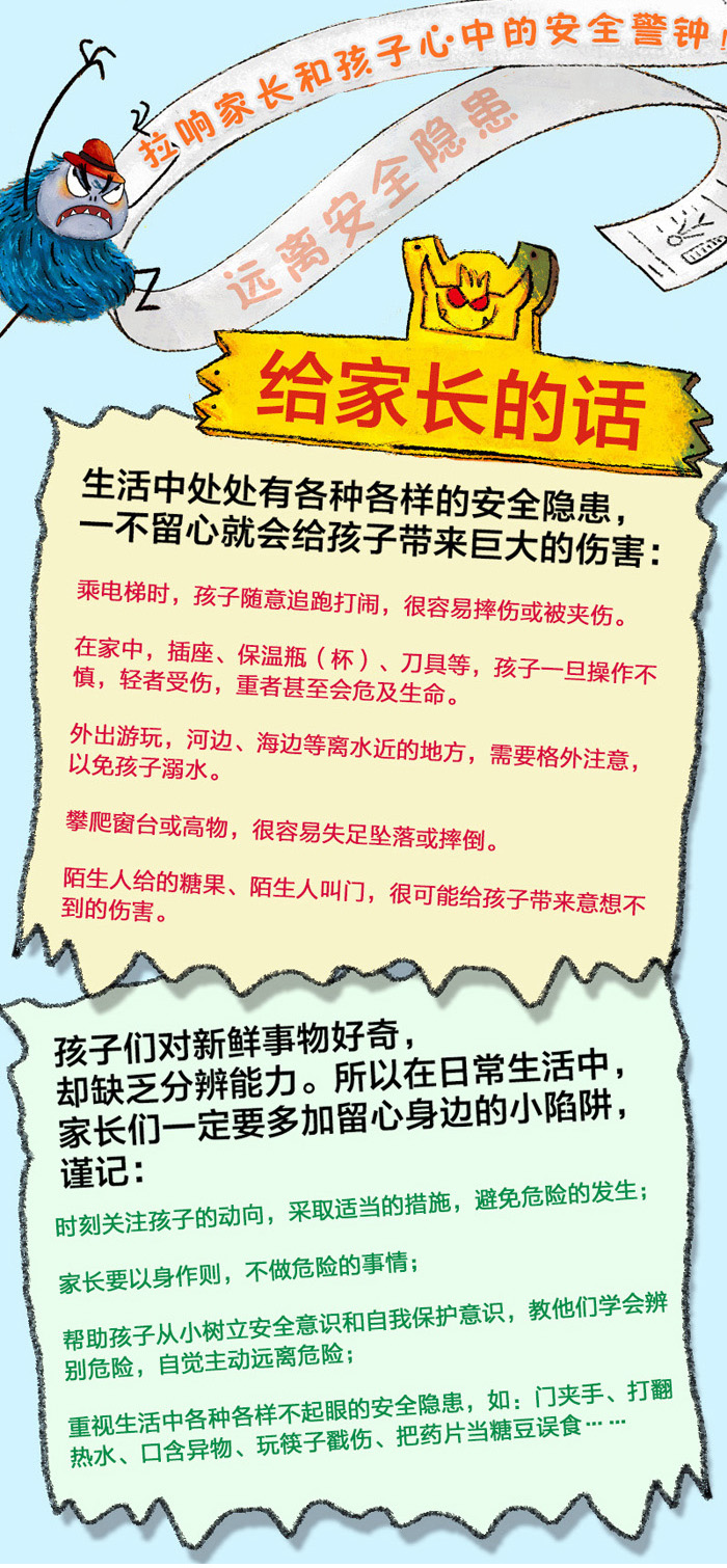 无论在家中,还是在户外,生活中处处有着各种各样的安全隐患。本书通过大胆新奇的想法,将安全隐患通过怪兽之口,以自我夸耀的方式讲述出来,使得孩子在哈哈大笑的同时,学会辨别危险、保护自己。该绘本用充满创意的故事告诫家长和孩子,要时刻警惕危险的发生,远离怪兽布下的陷阱,是一本难得的兼具教育意义和趣味性的佳作。