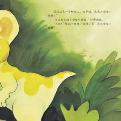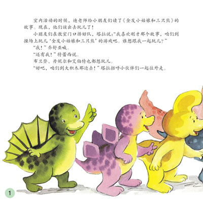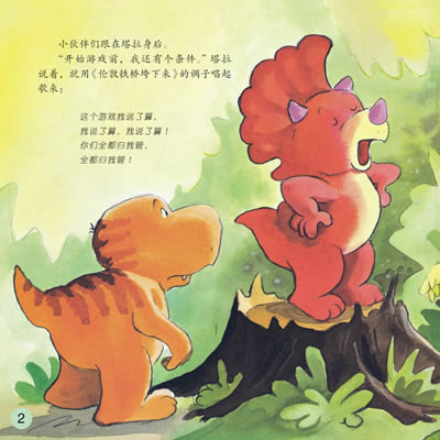 最后要说的,是系列图画书的最大亮点:这是一套可以边读边唱的图画书,每个故事里都穿插了两小段诗歌,一首出现在小恐龙遇到挫折、出现心理波动的时候,另一首则出现在问题得到解决、心情豁然开朗的时候。我在以往给孩子们读书的过程中总结有这样的经验:孩子们最喜欢在听一个故事的过程中,穿插一小段能唱起来的儿歌,她们会跟着唱,而且会非常开心。于是,在翻译这些小诗时,我特意和出版社的编辑一起寻找了一些中国家长比较熟悉的欧美儿童歌曲,把诗歌处理成歌词的形式套用进去,并力求词句的上口和节奏、韵律的合拍。我们希望爸爸妈妈在给孩子读书的时候,真的能开口唱起来。也许我们自己唱歌“五音不全”,没有关系,只要满怀信心地大声唱出来,孩子们一定会非常开心,他们才不在乎自己的爸爸妈妈唱歌是不是“跑调儿”呢,而且很快也会参与其中。亲子共读,共唱,这样其乐融融的景象,是不是很令人向往?