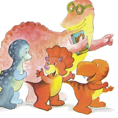 值得注意的是,在系列图画书中,作者有意轻描淡写爸爸妈妈的形象,真正的主人公只有一群可爱小恐龙和他们和蔼、睿智的迪老师。这正是系列图画书的独具智慧之处:帮助我们的孩子在离开爸爸妈妈的时候,学会自己解决问题,培养真正独立的人格、积极的心态和快乐的心情。