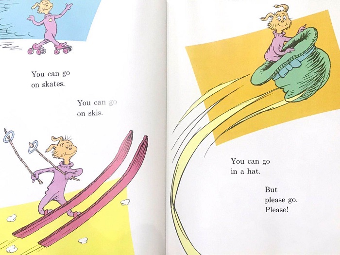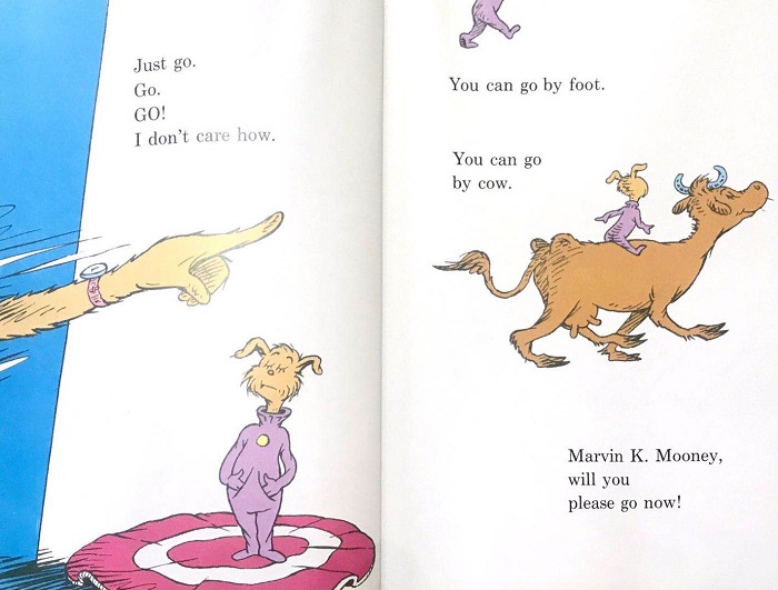 Marvin K. Mooney,我已经帮你想好了数十种离开方式,拜托你可快上路吧!在这数十种离开方式中,有常规的方法,也有不可思议的新颖方法。苏斯博士大橙书系列想要引导读者进行想象与思维发散的初衷在这则故事中展现得淋漓尽致。想象之所以称为想象,便不应为现实所束缚!