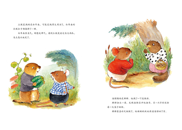 2.水彩手绘插图,形象饱满可爱;情节波折起伏,处处充满悬念。故事中小老鼠们被一只只拉出队伍,在“历险”后又被一只只送回去,循环式的情节设计,激发孩子的好奇心和探索欲。