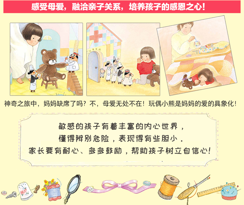 在佳佳与小熊的神奇之旅中,妈妈貌似是缺席的,但*后一页清楚明白地表明,是妈妈帮佳佳拔了刺、给小熊缝合开线的手臂,玩具医院则是妈妈的缝纫盒。