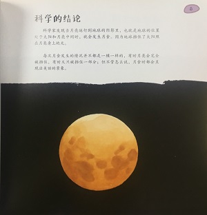 今晚的月亮看上去很奇怪——它并不像往常那么明晃,而是呈现出特别的暗红色。爱丽丝和奥利弗都很吃惊,月亮会不会是被巫婆施了魔法?爱丽丝的妈妈微笑着解答了他们的疑惑:这并不是什么魔法,而是一种名叫月食的自然现象。她给爱丽丝和奥利弗讲了很多关于月亮的知识,比如月亮不仅在晚上出现,其实白天里它也一直在,只是白天的阳光实在太明亮,遮住了月亮的光线,所以大家才看不见月亮。而且,月亮围绕着地球一直不停歇地转啊转,它是地球的伙伴。