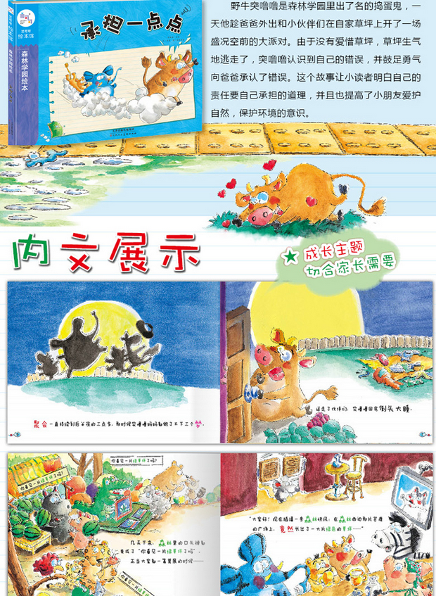 一天,野牛突噜噜趁着爸爸外出和小伙伴们在自家草坪开了一场盛况空前的大派对。由于没有爱惜草坪,草坪生气地逃走了。突噜噜认识到自己的错误,他最终鼓足勇气向爸爸承认了错误,爸爸为他的诚实和敢于担当而骄傲。就这样,丢失的草坪又奇迹般地回来了,突噜噜也懂得了爱惜和呵护草坪。这个故事让小朋友们在愉悦的阅读氛围中学会了自己的责任自己承担的道理,并且也提高了爱护自然,保护环境的意识。