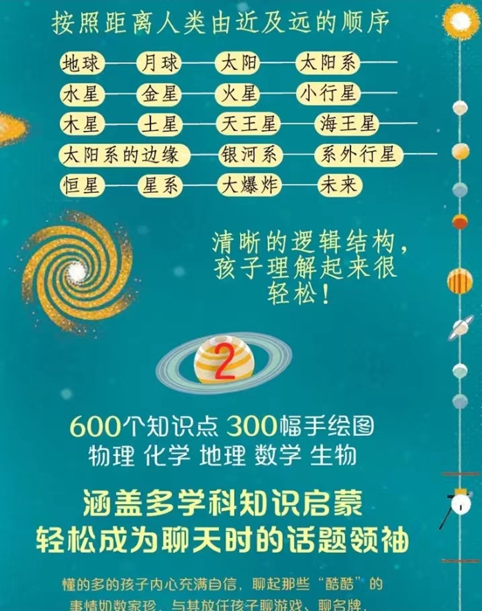 本书自英国引进,是一本关于太空主题的儿童科普绘本,本书由近及远的逻辑展开介绍,先从地球开始,然后介绍月球和太阳,太阳系的行星,进而引出银河系的相关知识,最后将视角拉至更广阔的太空,探索恒星的起源、了解大爆炸等等。在展示太空基础知识的同时,还介绍了人类执行过的著名太空探索任务。内容框架符合太空认知逻辑,语言精准凝练,用几十页的图文内容将太空宏观知识娓娓道来,既保证知识的准确性又兼顾孩子的理解能力,读完此书,孩子将对太空拥有宏观层面的认识,对引导孩子热爱科学、探索未知颇有裨益。