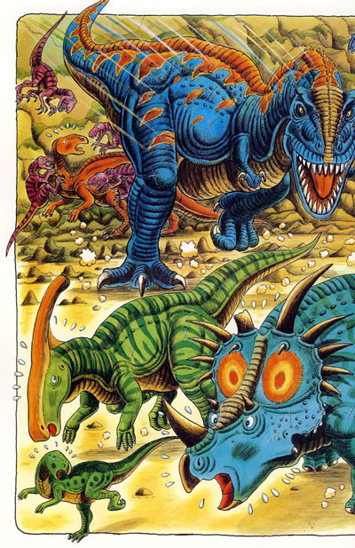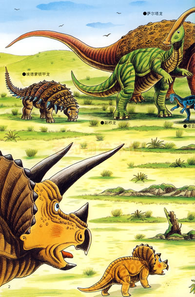 由于气候的变化,绿色的森林和草原变成了荒野。一群三角龙为了寻找富饶的绿色新天地,正继续向遥远的南方迁徒。