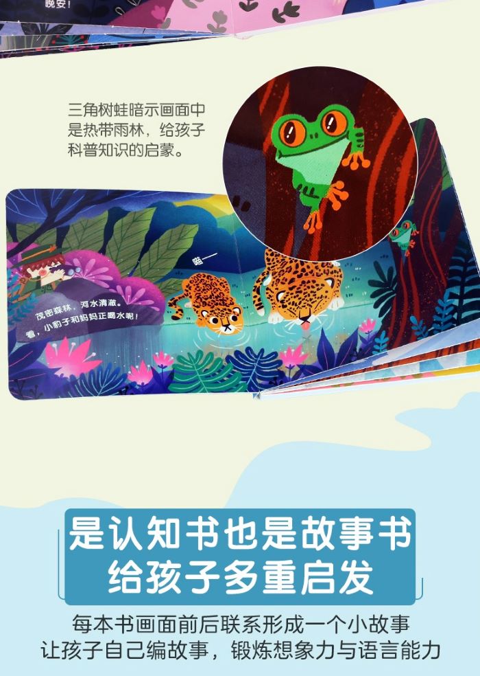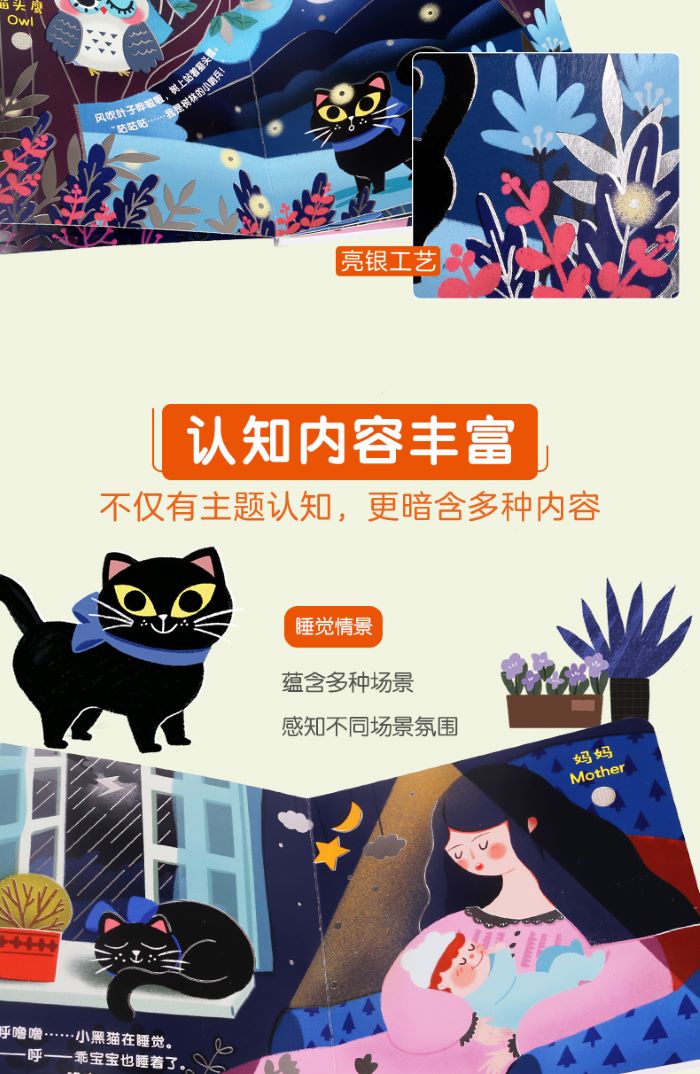 这是一套针对0~3岁低幼儿童的多媒体低幼认知书,包括发声和烫金(银)两种工艺。本套丛书一共2册,分别包括:《夜晚》《动物的家》。每册介绍5种认知物。每种认知物都有中英双语注释,带有烫金(银)工艺和声音,真正做到对事物的全方位认知。《夜晚》向小朋友介绍了宁静的夜晚,有熟睡的宝宝,有活动的动物,有忙碌的货船等。这套书不仅是简单的认知,还带有故事性,让孩子的认知更有趣。