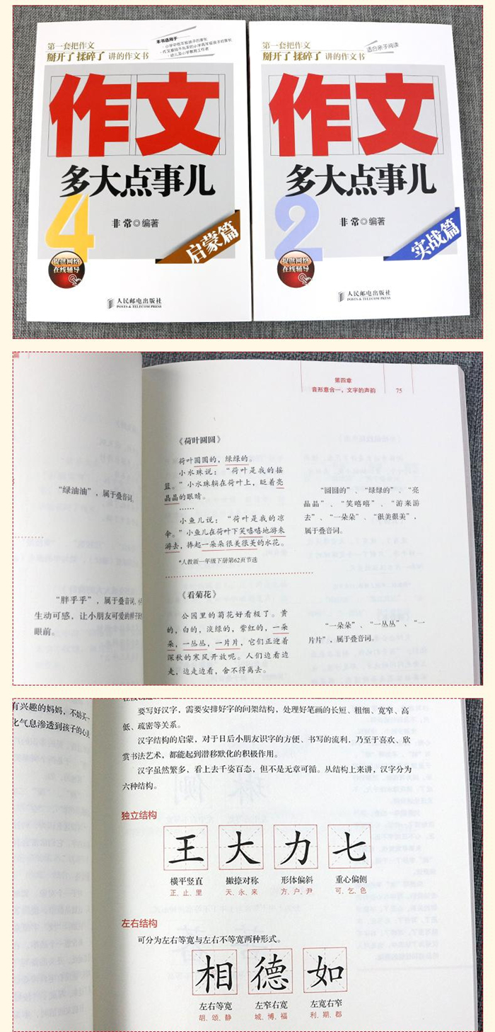 《作文,多大点事儿——提高篇》是“作文,多大点事儿”系列的第三本。如果说头一本“基础篇”与第二本“实战篇”是“四个对称”、“六根六尘”与“作文八法”的基本入门的话,《作文,多大点事儿——提高篇》则定位于作文提高。通过对一些常见的写作技法更深入地讲解,让已基本掌握“四个对称”、“六根六尘”与“作文八法”的孩子在写作方面得到进一步的提升。具体的写作技法包括:借音借义的运用;六根六尘的通感运用;驴头不对马嘴句的运用;相片与相框的运用;对比反差(写冷以热、写黑以白)的运用;乾坤颠倒、回环的运用;引经据典的运用;结构对称把作文串起来的运用等。