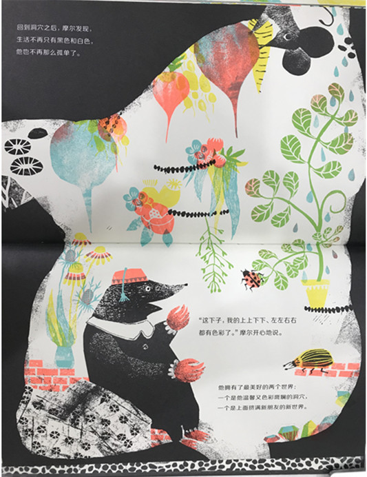 鼹鼠摩尔住在地底下一个只有黑色和白色的洞穴里,他唯一的朋友,是一盏明亮的粉红色萝卜灯。摩尔喜欢朋友身上那鲜艳的色彩,有时候,他会想:要是探出头去看一看,是不是会看到一个更大的世界? 这是一个关于走出孤独、寻找友谊、勇敢走出舒适区的故事。当我们为了寻找光而来到隧道尽头,当我们冒险走出自己的舒适区,一个丰富多彩的世界正在等待我们。这个故事歌颂的就是这一切。