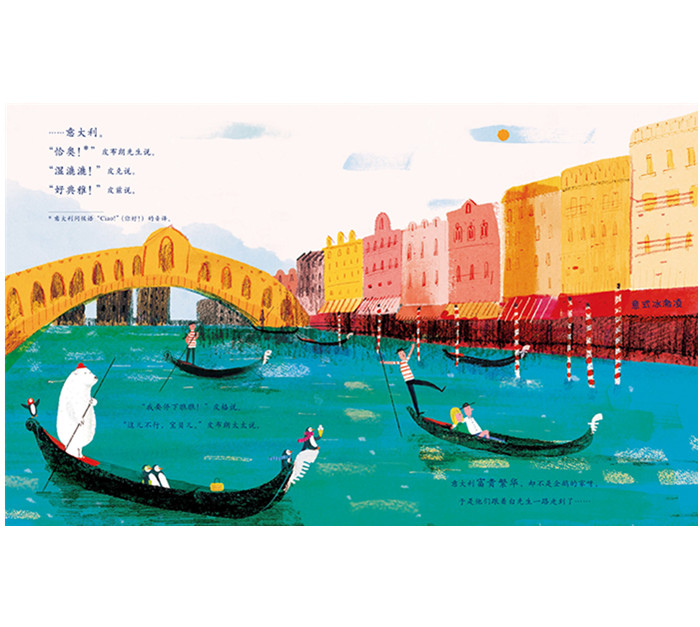 本书是本儿童图画故事。讲了企鹅一家野餐迷了路,转弯转错了到了北极,碰到了北极熊白先生,白先生给了企鹅一家一颗冒险的心,从北走到南,先到了现代化的美国,又到了用皇家气质的英国,到了广大而神秘的印度,去了有华丽大剧院的悉尼。在充满冒险又温馨气息的画面中,北极熊先生和企鹅一家带着小读者们走过了很多城市,最后终于回到自己家中,发现,不论去到那里,自己的家才是最美好的地方。绘本很有故事性,还能够教会孩子们很多国家的特色和新词汇。