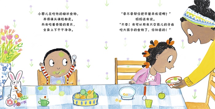 故事开始时,小女孩面临着一个“大问题”:房子里多了一个新生儿,她的家庭地位改变了……赏心悦目的插图、朗朗上口的语句,会抚慰读者的焦虑。看到小女孩开始感觉到做大孩子的优越感时,看到她学会了分享、开始帮助弱小的弟弟时,读者会忍不住欢呼“好棒”。