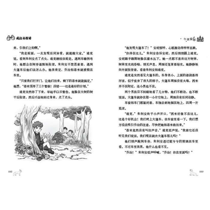 《疯狂侦探团》讲述了朱利安、迪克、安妮、乔治四兄妹和一只叫作蒂米的大狗的侦探冒险故事。这五名小将多次历经许多孩子梦寐以求的冒险旅程,在岛屿、在荒野、在海上、在山丘、在农场……他们的身影无处不在,如闪电般耀眼,所到之处怪事、趣事层出不穷,惊险刺激,这个堪称世界上zui棒的少年侦探团,zui后总能将坏蛋绳之以法。让我们在21个高潮迭起的冒险故事里,感受 “疯狂侦探团”的神秘魅力!