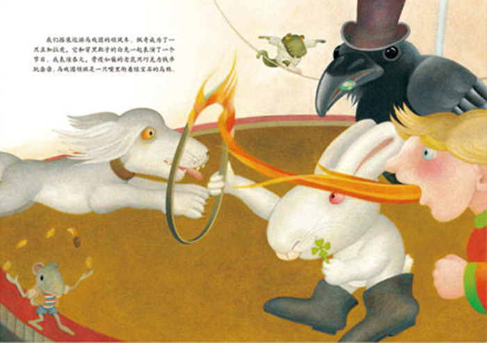 富有想象力的插图描绘了维克多和佩奇在荒诞不经的场景中自由驰骋和冒险,打电话的老鼠和带高帽子的乌鸦,更是平添了几分夸张和幽默,具有超现实主义色彩。