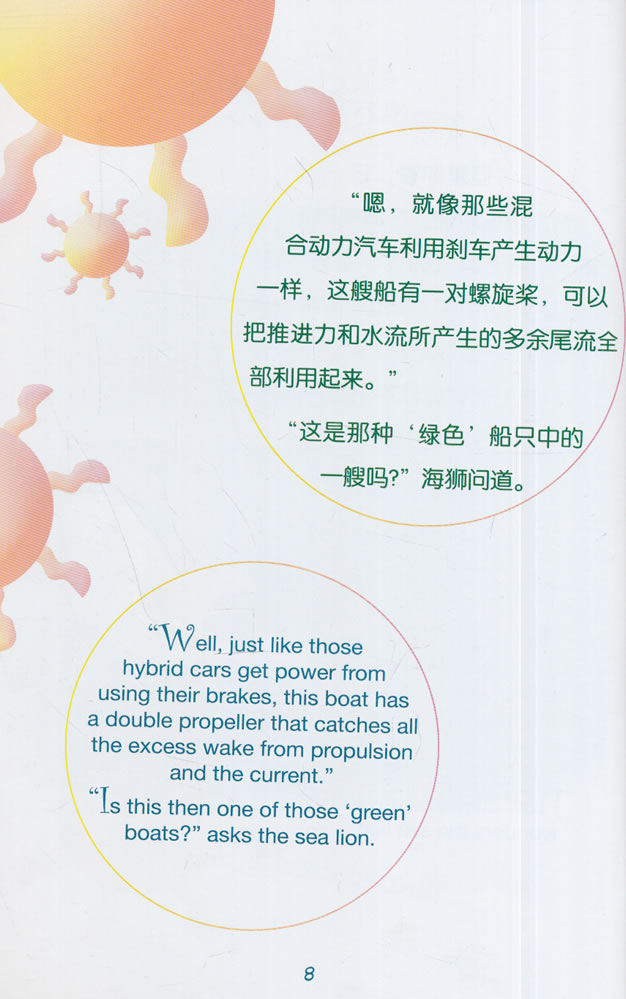 “但是你看,它 有太阳能电池。”海鸥评论道。“这艘船甚至利用螺旋桨引 起的湍流产生动力,我从这上面可以看到。”他补充说。 “这是怎样起作用的呢?” 海狮很好奇。