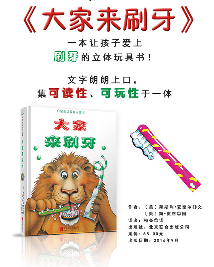 我和两岁的孩子每天早上和晚上都会翻看这本书。“让我们像狮子一样刷牙吧!”很棒的立体书,能够让孩子一起参与。