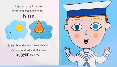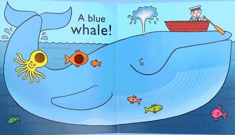 画面上男孩和蓝鲸的大小对比十分有趣,整个画面与蓝色完美呼应。刚才的镂空洞洞又成为五彩缤纷小鱼的身体一部分。