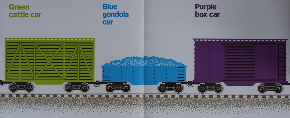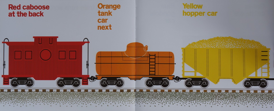 The freight train stands still at first, all owing readers to count the cars, name their colours and iden tify their functions. Then the train picks up speed, zooming across the page in a blur of colour, speed and sound.