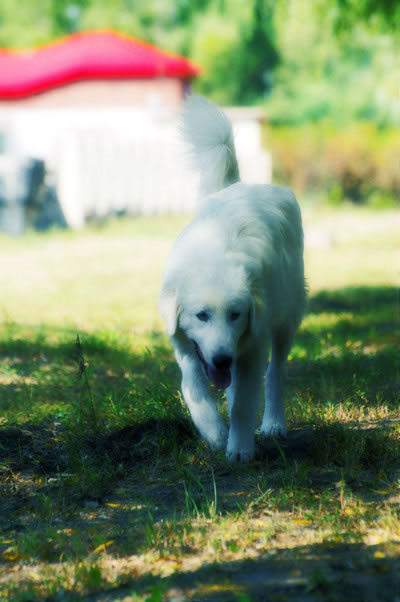那是雌性的小犬体形略小,与雄性的小犬相比,温顺调皮,目光中总是流露出一种少女般的羞涩。它总是像影子一样跟随在小雄犬的后面。