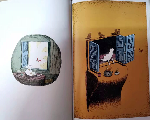 《猫咪与飞蛾的奇妙之旅》是一本脑洞大开、激发孩子想象力和哲学思考的绘本,曾荣获博洛尼亚童书展插画奖。该书以一只猫咪和一只蝴蝶为故事线索,引导读者们来到一个奇幻的世界。一开始看图,读者可能以为是猫咪在追着蝴蝶,跳出了窗外,穿过了大树,横跨了城市,来到了一只绵羊的胃里。看到故事的后半部分,读者就会发现,原来猫咪在蝴蝶的身上,蝴蝶在罐子里,而罐子又在猫咪的旁边。这看似是猫咪看到蝴蝶之后的遐想,其实包含了深层的哲学道理:事物不就是你中有我、我中有你,相互联系和转化的吗?这一故事值得孩子和成人读者反复阅读、深入思考。