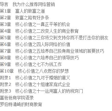本书中,清崎讲述了富爸爸的11种核心价值观,提供了一种更理想、门槛更低的商业模式,即如何建立人脉网络来创造财富、分享财富。在这里,你将接受全新的财商教育,进入一个鼓励犯错、用于修正自己的商业世界;在这里,你将学会商业实战所必需的领导技巧、沟通技巧、资金管理技巧、投资技巧、会计本领、时间管理技巧,一跃成为真正的企业家。