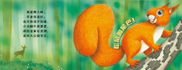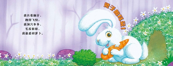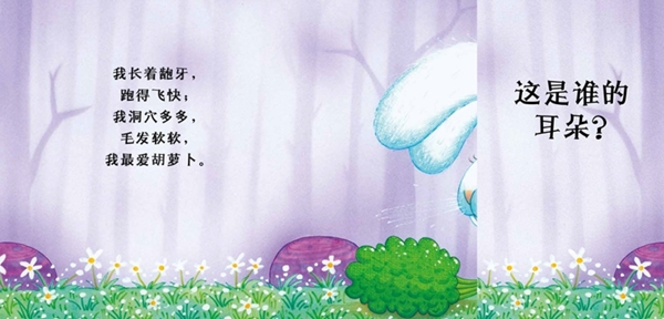“猜猜猜”系列丛书采用翻翻书设计手法,其中可展开的折页分别展示一种动物。在掀开书页之前,宝宝只能看见每一种动物的耳朵、鼻子或者尾巴,与此同时,简单有趣的文字会给宝宝供相应的线索。