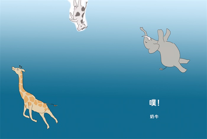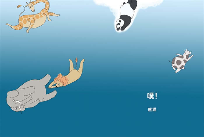 本书是一本少儿文学绘本。噗!一头大象……噗!一只长颈鹿……接着,奶牛、熊猫……动物们一个接一个都“噗!噗!噗!”地掉下来!他们在做什么呢?故事的最后,一双小脚进入了画面。能猜到他们在玩什么游戏吗?故事的最后,揭示了谜底:原来是小朋友在浴缸里洗澡呢!