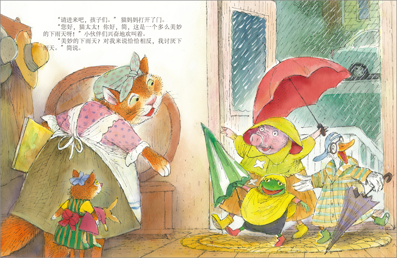 小猫咪简讨厌下雨天!在简的印象里,每到雨天,到处都是灰蒙蒙,湿漉漉的一片。忽明忽暗的闪电、轰隆隆的雷声更是令简毛骨悚然。忽然在一个下雨天,随着简的朋友们登门拜访,这一切都发生了改变。聪明又耐心的小伙伴们尝试着用各种有趣的方法,帮助简克服了对雷雨天的恐惧,甚至让简爱上了下雨天!